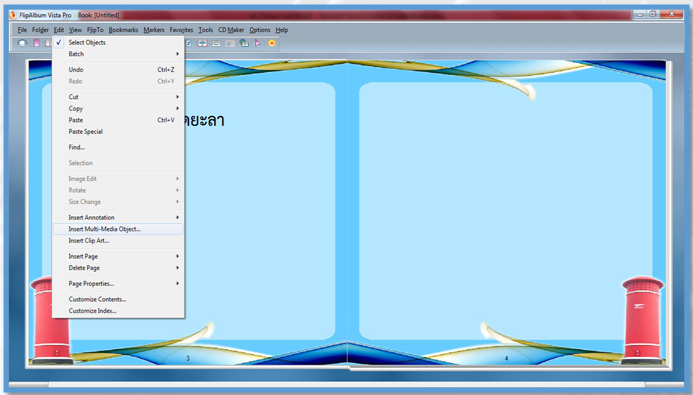 1. การแทรกรูปภาพคลิกเมนู Edit เลือก Insert Multi-media Object... จะปรากฏหน้าต่างดังภาพแล้วเลือกภาพเสียงหรือวิดีโอที่ต้องการโดยการลากมาวางบนหน้ากระดาษของหนังสือ